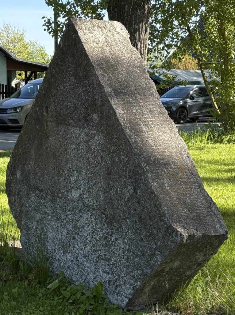 Dieser Gedenkstein erinnert an die Bodenreform, die nach dem zweiten Weltkrieg den Umsiedlern , den sogenannten Neubauern Grund und Boden als Besitz zur Verfügung gestellte und eine neue Heimat bot. ( Quelle: https://de.wikipedia.org/wiki/Neubauer_(Agrarreform))